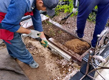Далее приступаем к установке подставки памятника. После того, как она была возвращена на своё место, размечаем цветник. Параллельно работаем с периметром могилы: по краю пускаем металлическую планку, которая послужит границей брусчатки.